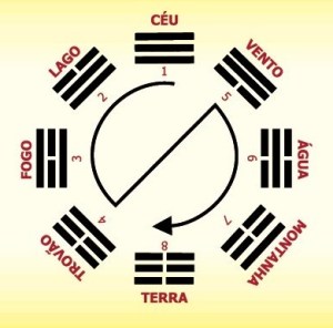 A seta desenhada no círculo dos Trigramas indica a ordem no sistema I-Ching do movimento do Tao